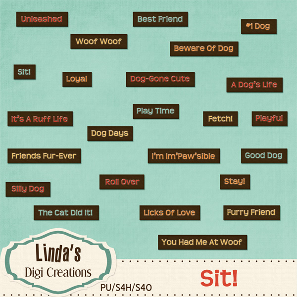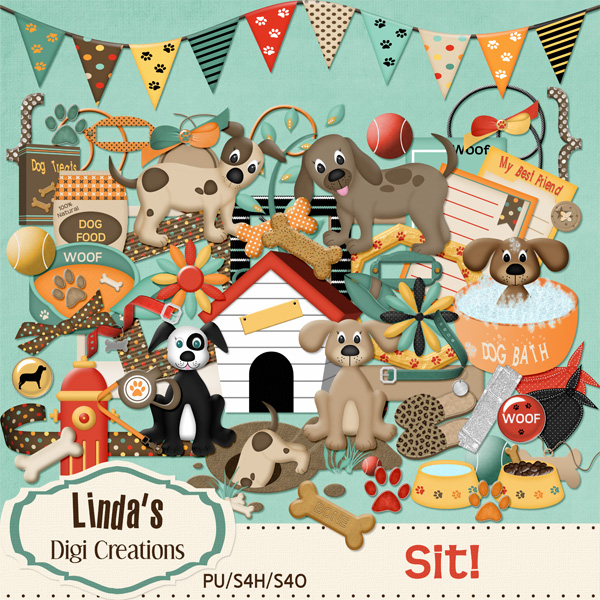 30 (12x12) Papers, 2 Bandanas, 5 Bones, 2 Bookplates, 3 Bows, 2 Brackets, 4 Buttons, 4 Dogs, 1 Dog Bed, 2 Dog Bowls, 2 Collars, 1 Dog Digging, 1 Bag of Dog Food, 1 Dog House, 1 Dog in Bath, 1 Box of Dog Treats, 1 Fire Hydrant, 1 Flag Banner, 2 Flowers, 1 Foliage, 5 Frames, 2 Glass Buttons, 3 Journal Cards, 2 Leaves, 1 Leash, 1 Newspaper, 4 Paw Prints, 1 Ribbon, 2 Pairs of Slippers, 2 Strings, 2 Tags, 3 Tennis Balls, 25 Text Strips, 3 Pieces of Washi Tape and 1 Alpha & Numeral Set (Upper case letters only).